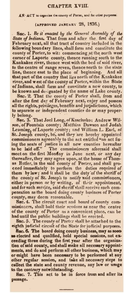 An Act to organize Porter County was approved on January 28, 1836. After February 1, 1836, through this act of legislation, an identified tract of land was set to be known as Porter County. The boundaries of Porter County would be marked as follows: “Commencing at the northwest corner of La Porte County, thence running south to the Kankakee River, thence west with the bed of said river to the center of range 7, thence north to the State line, thence east to the place of beginning.” The county would bear the name of Captain David Porter, naval officer war hero during the Barbary Wars and the War of 1812.