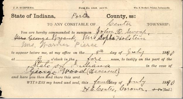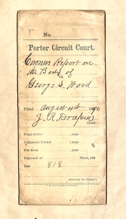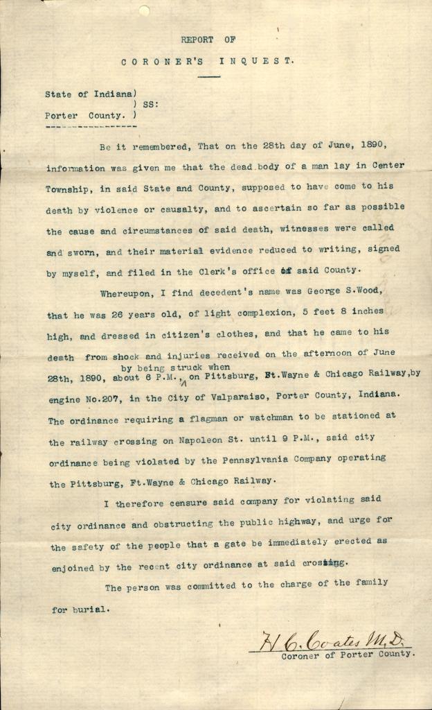 References: Porter County Clerk Archives, Coroners Inquest of George S. Wood filed on August 4, 1890; The Tribune Newspaper, Volume 7, Issue 12, Publication Date July 3, 1890