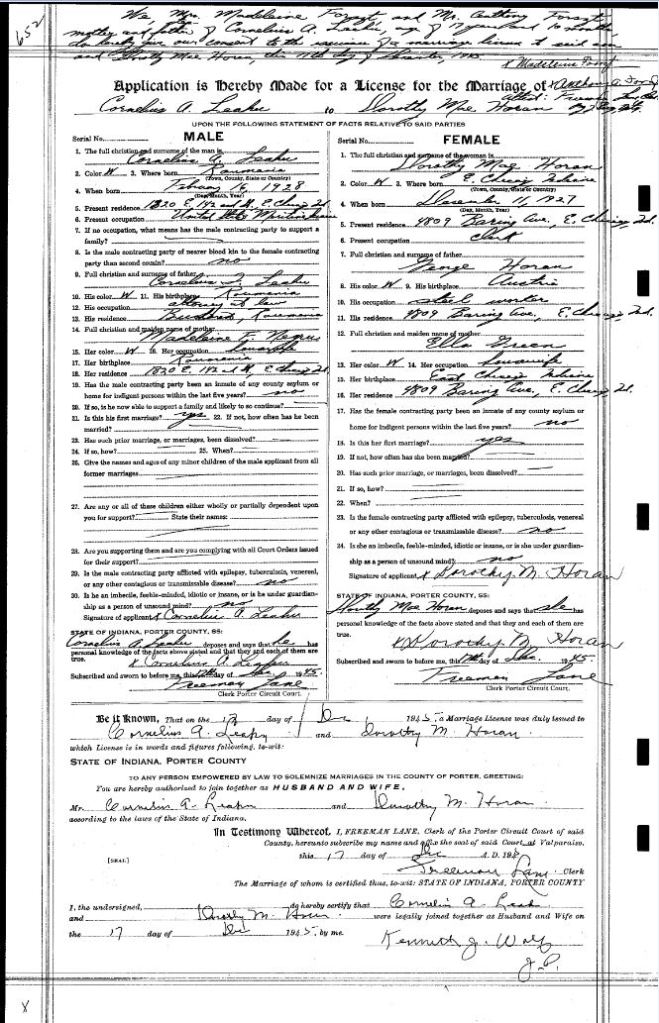 Cornelius and Dorothy completed their marriage license application in Porter County even though they both lived in East Chicago, Lake County. Back then, the marriage laws allowed them to apply in either county. They initiated their application in Porter County since they were wed by Kenneth J. Wolf, Porter County Justice of the Peace in Porter County.
