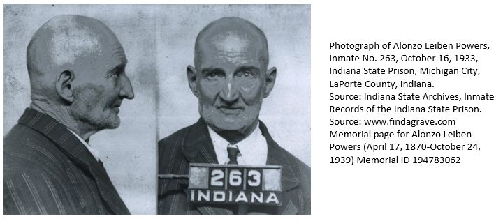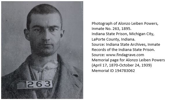Alfonzo Leiben Powers was committed to the Indiana State Prison in Michigan City, Indiana on December 10, 1895. He drew prison number 263. On April 11, 1912, he was declared mentally unfit and was transferred to the insane hospital where he remained until his death. He served 44 years in prison until his passing at 72 years of age of cardio-vascular disease and cerebral arterio-sclerosis. Up to that point, more than 20,000 inmates were committed to the state prison. Upon his death, it was thought that he had a daughter but his remains went unclaimed. No family, if any, ever stepped up to identify him as their own. Instead, he was given a prison burial.
