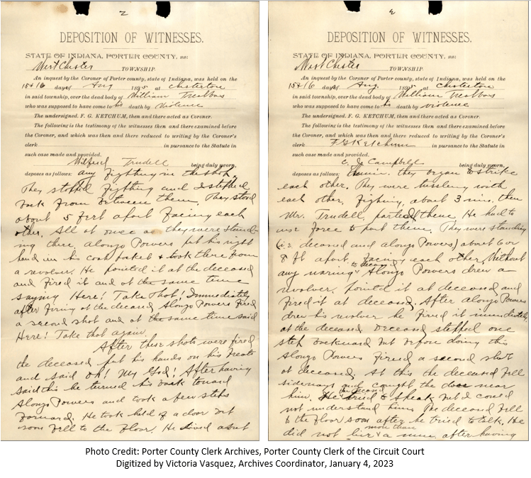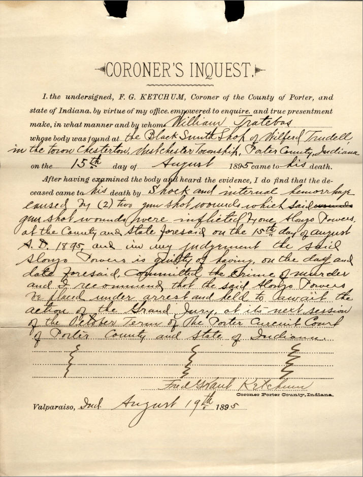 References: Porter County Clerk Archives, Coroner’s Inquest, filed with the Clerk of the Circuit Court on August 31, 1895, Porter County, Indiana [Recovered and Archived by Victoria Vasquez, Porter County Clerk Archives Coordinator, January 4, 2023, Portage, Indiana]