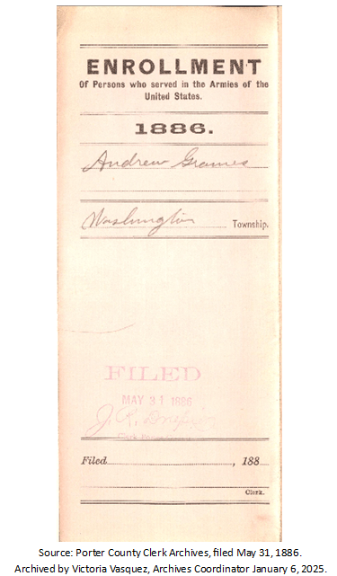 By 1885, soldiers who served in the United States Army for any war were required to enroll with their local Township Assessor’s office and have such enrollment recorded with the Porter County Clerk of the Circuit Court pursuant to Indiana law. The Porter County Clerk Archives has preserved what remains of these records along with other details about the men and their military service.