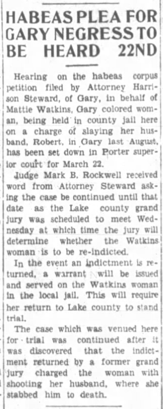 We may never know what caused Mattie to commit such a heinous act. City of Gary police officers were called to the scene while the patrons at the tavern witnessed the feud. Mattie was later confined at the Crown Point jail. Attorney Harrison Steward, of Gary, formerly of Valparaiso, represented her. The case against Mattie Watkins was soon underway.