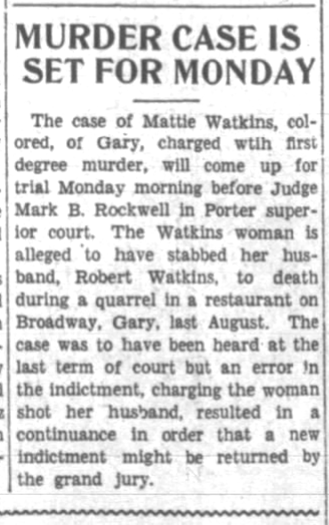 Superior Court Judge Mark Rockwell sentenced Mattie Watkins to serve 2 to 21 years in the Women’s Prison at Indianapolis on the conviction of manslaughter for stabbing her common-law husband, Robert Watkins to death on August 8, 1934.