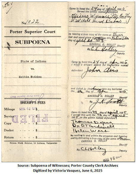 On Monday, April 29, 1935, witnesses were summoned to appear in the Porter Superior Court at 9:00 AM to testify in the action against Mattie Watkins. Those subpoenaed to court included Gary Police Officers Nick Burbas, Roy Wymore, C. H. McCarthy and Al Waite, along with citizens, Thomas Dopas, Pete Naum Rose, Dr. D. T. Cardwell, Helen West, Walter Thornton, Laura Ayers, John Valentine, John Airs, and Loretta Culph, all of Gary, Indiana.