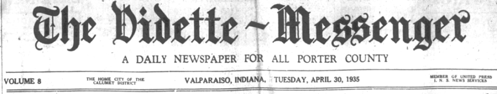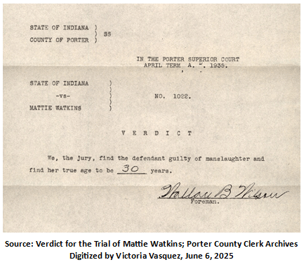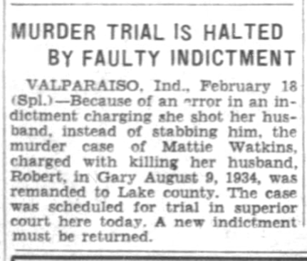 References: Porter County Clerk Archives records of Lake County Cause Number 15126 and Porter County Cause Number 1022, January to April, 1935; The Indianapolis Star, Monday, February 18, 1935; Page 17; The Indianapolis News, Monday February 18, 1935; Page 12; The Times, Monday, February 18, 1935; Page 20; The Times, Friday, March 8, 1935; Page 13; Vidette-Messenger of Porter County, Tuesday, March 12, 1935; Page 2; Vidette Messenger of Porter County, Tuesday, March 19, 1935; Page 1; The Times, Tuesday, March 26, 1935; Page 1; Vidette-Messenger of Porter County, Tuesday, April 23, 1935; Page 1; The Times, Wednesday, April 24, 1935; Page 45; Vidette-Messenger of Porter County, Saturday, April 27, 1935; Page 2; The Times, Monday, April 29, 1935; Page 37; Vidette-Messenger of Porter County, Monday, April 29, 1935; Page 2; Vidette-Messenger of Porter County, Tuesday, April 30, 1935; Page 1; The Times, Thursday, May 02, 1935; Page 9; Journal and Courier, Friday, May 3, 1935; Page 7; The Times, Friday, May 3, 1935; Page 13; Ancestry.com, U.S. Indiana Death Certificates 1899-2017; Indiana State Board of Health Death Certificate for Robert Watkins Registered Number 25622, Gary, Lake County, Indiana