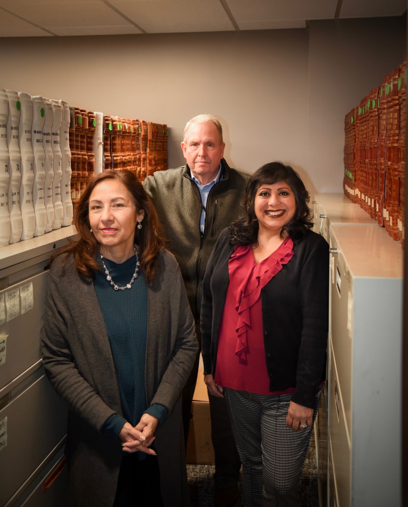 Members of the Archives team are pictured with its old marriage record books. These books are held in a temperature controlled environment.